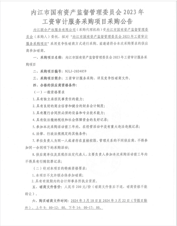 內江市國有資產監(jiān)督管理委員會2023年工資審計服務采購項目采購公告